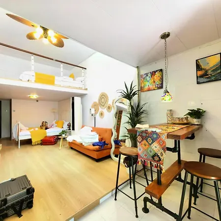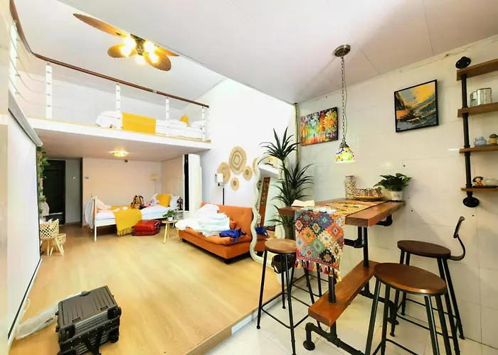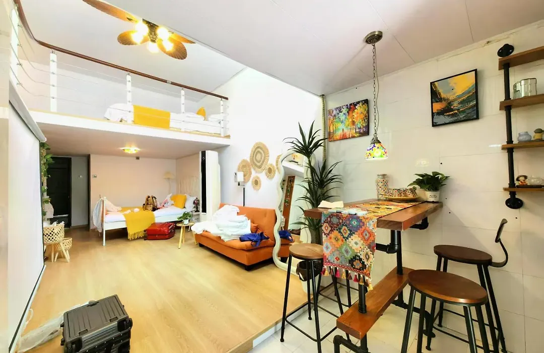 The spacious Shanghai Hills & Aromahome Terrace Loft With 4K Projector Clsoe To Line 9&12 apartment is located in Shanghai, 10 minutes' drive from the 5 - acre Yu Garden, and boasts a Jacuzzi. Wi-Fi is available for guests' business or leisure needs.